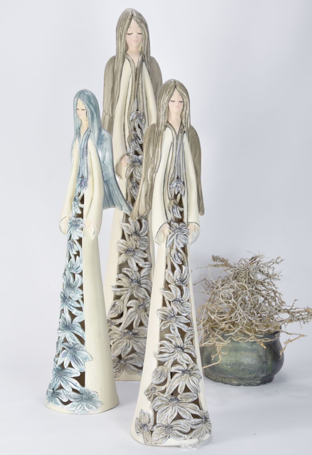 Model anioła o wysmuklonej sylwetce, w długiej sukni z kwiatowym motywem.